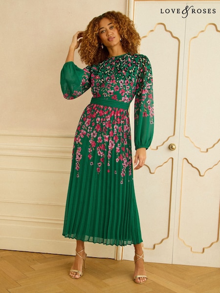 Love & Roses Blue Ombre Chiffon Pleated Midi Dress
